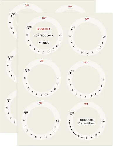 La etiqueta adhesiva para el dial de la estufa tiene un diámetro interno de 52 mm y un diámetro externo de 68 mm, se ajusta a la mayoría de los tamaños de dial de la placa de cocina y por favor mida los diales de su cocina para asegurarse de que estos encajen. Recibirás 12 piezas de pegatinas para diales de estufa, perfectas para reemplazar las marcas desgastadas, y estos vinilos son la solución perfecta para identificar los quemadores. Las calcomanías transparentes para encimera están hechas de material de vinilo transparente, impermeables y duraderas. Es resistente al desgaste y no se desgasta fácilmente. Puede ayudarle a identificar fácilmente la información de la estufa, adecuado para estufas, quemadores, estufa GE, cocinas, hornos y más. Estas etiquetas adhesivas con símbolo de perilla se adhieren directamente a las perillas de la estufa, y puedes usar las pegatinas incluidas para personalizar cada perilla de la estufa a su propio quemador y posición. Las etiquetas para la estufa con impresión NEGRA en transparente y es más adecuada para una estufa/horno de color plateado, blanco o claro. No apto para una estufa NEGRA.