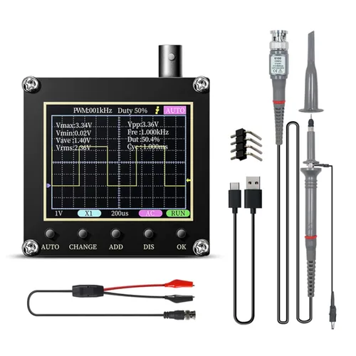 Velocidad de muestreo más rápida: el mini osciloscopio Mivofun tiene una tasa de muestreo en tiempo real de 2.5 MS/s y un ancho de banda de 200 KHz. La sonda 10x puede medir hasta 800VPP, lo que equivale a 280V CA. Se pueden medir voltajes de hasta ± 400 V. Rentable y más precisión: cuenta con función de disparo completo (Auto/Normal/Individual). Funciona perfectamente tanto para señales analógicas periódicas como para señales digitales aperiódicas. Salida de onda cuadrada PWM integrada. Pantalla LCD de alta definición de 2.4 pulgadas, una resolución de 320* 240, interfaz tipo C admite la transmisión de datos y la interfaz de carga. Soporte para actualizar el firmware directamente. Osciloscopio portátil pequeño y práctico: el osciloscopio de bolsillo Mivofun es una máquina con acabado ensamblado, ligero y fácil de llevar, se puede utilizar directamente para evitar problemas en el proceso de soldadura y ahorra mucho tiempo de montaje. Aplicable al lugar de trabajo como familia, escuela y fábrica. Fácil de medir: equipado con un ajuste automático eficiente de una tecla de todos los parámetros, la forma de onda medida se puede mostrar sin ajustes engorrosos. Pulsa el botón AUTO para calibrar rápidamente la línea de base, medición rápida de formas de onda, mejorar la eficiencia del trabajo. Lista de embalaje: el paquete incluye una máquina acabada ensamblada, un cable de datos de interfaz BNC universal, una sonda 10X.