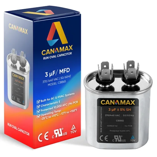 NOMBRE DEL PRODUCTO: Condensador de arranque ovalado de 3uf MFD 50/60 Hz 370-440 VCA ALTA COMPATIBILIDAD: Reemplazo para GE C403 C403L C303 C303L 97F5503 97F5503BX 27L987BX 27L986 27L1022 27L1022BX 97F5503 97F5503BX 27L987BX 27L986 CPT-0209 CPT00209 CPT0209, Dayton 4X425A, MARS 12003 12027, JARD 12903 12919 CR3X440 - Supco y otros condensadores de arranque con la misma clasificación de uF/Mfd y VAC. CALIDAD PREMIUM: El condensador de arranque ovalado 3uf MFD 50/60 Hz 370-440 VCA voltios se fabrica bajo los estándares más estrictos de EE. UU. para condensadores de funcionamiento de motores de CA, incluidos EIA-456-A e IEC 60252-1:2001. Interruptor de presión antiexplosión de 10,000 AFC y no se utilizan PBA AHORRA TIEMPO Y DINERO: Ahorra mucho dinero y solo requiere unos minutos para la instalación para ayudar a que tu aire acondicionado funcione correctamente de nuevo. [CANAMAX] Protección de por vida: Nos dedicamos a ofrecerle piezas de repuesto de calidad probadas para su eficiencia. En caso de que nuestro producto no le sirva para el propósito al que está destinado, ofrecemos un reembolso sin preguntas. Obtén compras sin riesgo con nosotros.