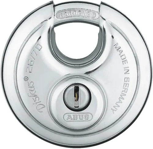 El bloqueo de disco es una forma especial de candado con algunas ventajas distintas. La forma del disco combate eficazmente las formas más comunes de forzarlo a abrir. El diseño con solo una pequeña abertura en el grillete hace que sea muy difícil manipular. Como el ABUS Diskusis está hecho principalmente de acero inoxidable, se utiliza especialmente donde se requiere seguridad y protección contra la corrosión. Protección completa de 360 grados. La familia Diskus está disponible en modelos con diámetros entre 50 y 3.150 in. El Diskusis original solo está disponible en ABUS. Como modelo especial, las cerraduras se pueden adaptar con un cilindro de disco (sistema de bloqueo ABUS-Plus) o protección de tracción de cilindro.