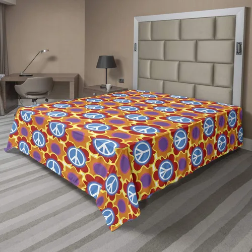 Ambesonne Hippie Flat Sheet, Psychedelic of Pacifism and Peach Flowers Cheerful Colors Joyful People Peace, Soft and Comfortable Top Sheet