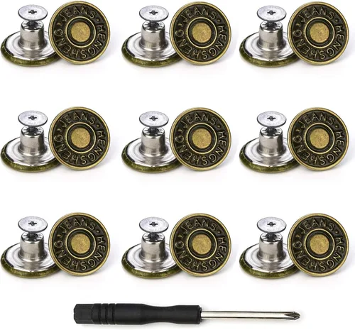 Ya sea que pierdas o ganes peso, el botón se rompe en tus jeans favoritos, debes tener estos botones ajustables a mano Versión actualizada: diseño de espalda plana no daña tu estómago, el poste se puede atornillar en el botón totalmente, más fácil y más seguro Botón sin costura: Coloque un agujero, atornille los botones de repuesto directamente, solo tome 1 minuto y deje que sus pantalones vaqueros/pantalones vuelvan a trabajar Tamaño de uso amplio: 0.669 in Diseño justo el tamaño adecuado para la mayoría de jeans, pantalones, chaquetas, tirantes, abrigos, vaqueros, bolsas y más Todos los botones Jean vienen en una caja de plástico transparente que es práctica, 9 tapas de botón, 9 remaches de rosca, 1 destornillador incluido
