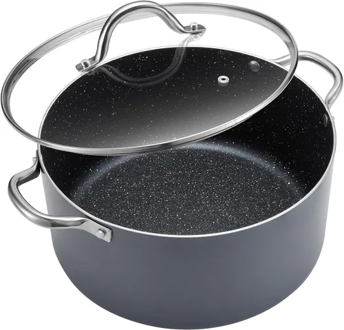 Olla de 6 cuartos con tapa: Perfecta para cocinar todos los días, esta versátil olla de cocina maneja sopas, guisos y pasta con facilidad—ideal para parejas y familias pequeñas Limpieza sin esfuerzo: apto para lavavajillas. La olla de sopa presenta un diseño de borde sin rebabas, lo que evita la acumulación de suciedad y facilita la limpieza Ollas ultraantiadherentes: garantizan una liberación de alimentos 3 veces mejor para una mayor durabilidad y limpieza sin esfuerzo Compatible con todas las estufas: estas ollas antiadherentes resistentes a la deformación funcionan perfectamente en estufas de inducción, gas, eléctricas y halógenas para una cocina versátil Distribución óptima del calor: hechas de aluminio premium, estas ollas de cocina con tapas garantizan un calentamiento uniforme para obtener resultados de cocción superiores Agarre seguro y cómodo: asas ergonómicas de acero inoxidable de esta olla con tapa, lo que facilita su manejo y maniobra durante la cocción Tapa de vidrio con sello hermético y resistente a las roturas: Perfecta para la olla grande para cocinar, mejora la eficiencia y permite un claro seguimiento del progreso durante el proceso de cocción