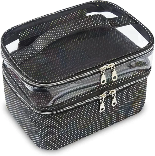 Nombre del producto Bolsa de cosméticos de doble capa Características: Diseño de gran capacidad: 9.5 x 7 x 6 pulgadas (largo x ancho x alto). - Se puede utilizar como bolsa de viaje, bolsa de cosméticos, bolsa de almuerzo, bolsa de práctica de uñas, etc. - El bolsillo superior está hecho de material transparente, por lo que puedes encontrar rápidamente tus cosas. - Puede contener las necesidades diarias básicas que necesitas. - Cremallera de doble capa, más firme, no se cae fácilmente. - Fácil de limpiar y lavar. - La cremallera es suave y duradera