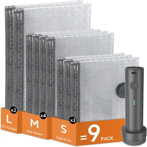 Bolsas de vacío de viaje con bomba de aire de carga inalámbrica, paquete de 9 bolsas de sellado al vacío con 3 tamaños para ropa, viajes, ahorro de