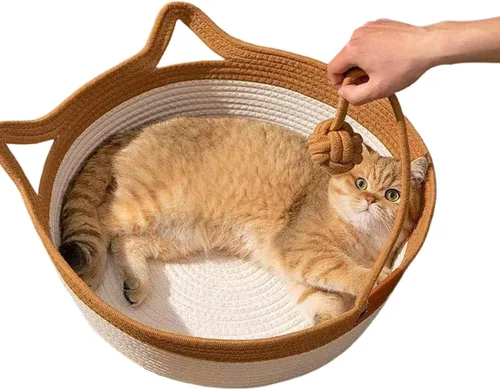 Material seguro y transpirable: tejido a mano con cuerda de algodón natural, apto para gatos, dando a los gatos un tiempo cómodo para la siesta, saludable y feliz todo el día. Durmiendo y raspadura: nuestra cama para gatos es rayable, satisfaciendo el amor natural de los gatos por rascarse y dormir, lo que traerá más diversión a los gatos, y nuestra cesta de dormir para gatos es lo suficientemente grande para gatos de menos de 22 libras. Fácil de limpiar y almacenar: nuestra cama para gatos es lavable, ventilada y transpirable, no es sofocante y no produce un olor desagradable. La cama para gatos se puede plegar cuando no se usa, ahorra espacio. Resistente a los arañazos: tejida con cuatro hebras de cuerda de algodón, nuestra cama para gatos tiene una excelente resistencia a los arañazos. Es muy duradero y no se rompe fácilmente. Diseño atractivo: nuestra cama tejida natural para gatos tiene un bonito diseño en forma de oreja de gato, por lo que es fácil recoger el nido de gato y llevarlo a cualquier lugar. Especialmente, hay una pelota de cuerda de algodón que juega unida al nido de gatos, disfruta del tiempo de juego con tu adorable gatito sin tener que ir a buscar juguetes.
