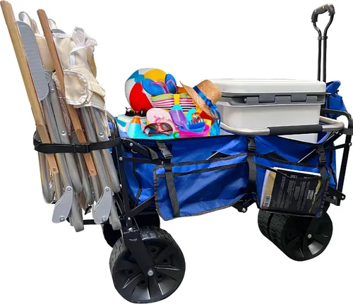 Este carro de gran capacidad puede contener todos tus artículos de playa como toallas, pelotas de playa, protector solar, sillas, sombrillas y todos tus otros artículos. Ahora puedes disfrutar de un día completo en la playa sin dejar nada atrás. Las sillas de playa no caben en los vagones, por lo que hemos diseñado y patentado nuestro exclusivo soporte para sillas de playa para facilitar el transporte de tus sillas y dejar más espacio en el carro para otros artículos. No pierdas tus objetos pequeños como protector solar, carteras, relojes, teléfono, etc. Poniéndolos en los bolsillos del costado del vagón. El otro bolsillo lateral sostiene tu paraguas unido al costado del vagón. Cuanto más grande sea la rueda, más fácil será empujar el carro en la arena. Nuestras grandes ruedas de 10 pulgadas hacen que sea mucho más fácil moverse a través de la arena que los carros de playa y otros carros. La mejor parte es que no te preocupes por los neumáticos pinchados, ya que los neumáticos son de plástico duro y nunca se desinflarán. Estamos tan seguros de que te encantará este vagón de playa que puedes probarlo durante 30 días y, si no estás satisfecho, simplemente devuélvelo para un reembolso.