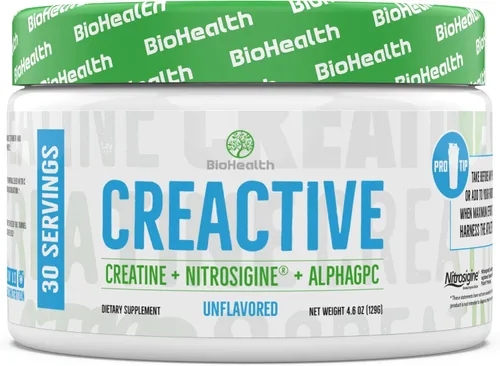Todos los beneficios de fuerza y resistencia de la creatina, sin ninguno de los efectos secundarios negativos comunes a otras creatinas. Maximiza la fuerza y el rendimiento sin estimulantes con CreActive. Biodisponibilidad superior: con la más alta solubilidad y biodisponibilidad, CreActive absorbe rápidamente. Si no puedes estómagar el monohidrato de creatina regular, entonces CreActive es para ti. Utiliza CreActive para una producción y vasodilación sin igual de óxido nítrico CreActive está infundido NOOTROPIC para mejorar la función cerebral y el enfoque. Toma antes de cualquier actividad física o añádelo a tu preentrenamiento favorito cuando se desee el máximo esfuerzo. Aprovecha al atleta que hay en ti