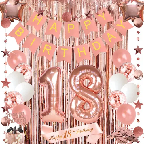 Decoraciones de cumpleaños número 18: hemos reunido todas las decoraciones de oro rosa para cumpleaños número 18 que necesitas para hacer que planificar tus decoraciones de cumpleaños de 18 años sea fácil e impresionante. El paquete de decoraciones único y divertido para fiesta de cumpleaños de 18 años puede ayudarte a iluminar la hermosa noche y hacer que las decoraciones de fiesta de cumpleaños de 18 años sean inolvidables. Combinación de gran valor: las decoraciones de cumpleaños número 18 incluyen 1 pancarta de cumpleaños de 18 años, 1 globo de oro rosa de 18 cumpleaños, 2 globos de papel de aluminio de estrella, 1 adorno para pastel de cumpleaños de 18 años, 1 banda de feliz cumpleaños 18, 2 telón de fondo de cortina de oro rosa, 1 guirnalda de oro rosa, 18 globos de oro rosa. Decoración perfecta: se utiliza para decoraciones de cumpleaños de 18 años para niñas, decoraciones de feliz cumpleaños de 18 años, decoraciones de cumpleaños de 18 años o crea una hermosa cabina de fotos o telón de fondo para complementar las decoraciones de cumpleaños de niñas. Fácil de montar: los globos de oro rosa del número 18 de 40 pulgadas incluyen herramientas (es decir, pajitas, cintas), solo tienes que inflar lentamente, llenar el 90% de los globos, espacio que podría permitir que el globo se expanda completamente. 6 globos metálicos de oro rosa + 6 globos de confeti de oro rosa + 6 globos blancos. Crea la fiesta perfecta de cumpleaños número 18 con estos globos duraderos. Satisfacción garantizada: compra nuestro brillante kit de decoración de fiesta de cumpleaños número 18 y añade aún más diversión a tus celebraciones. El paquete de decoraciones para fiesta de cumpleaños número 18 viene con todas las decoraciones de cumpleaños número 18 que necesitas. Si tienes alguna pregunta sobre nuestras decoraciones de fiesta de cumpleaños número 18, no dudes en ponerte en contacto con nosotros para una solución rápida a tu problema