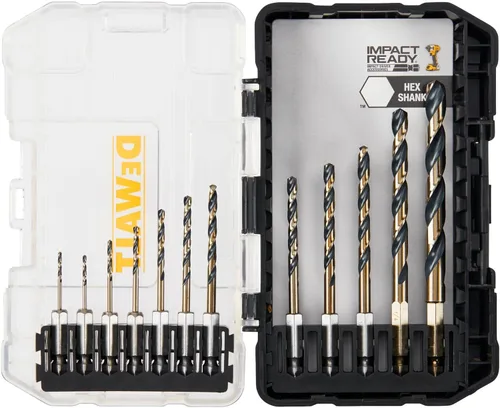 El 12 pc. El juego de brocas de metal negro y dorado es resistente al óxido, con un fuerte diseño de núcleo cónico que ayuda a resistir la rotura. Hecho de acero resistente de alta velocidad para perforar en una variedad de materiales, incluyendo plástico, madera y metal, cada broca cuenta con un 1/4 de pulgada. Vástago hexagonal diseñado para resistir el par axial con accionadores de impacto. El diseño de punta de división de 135° en 1/8 pulgadas. y tamaños más grandes ayudan a reducir la marcha. El 12 pc. El juego viene en un sistema duradero ToughCase+ que está diseñado para optimizar el espacio de almacenamiento y mantener tus brocas organizadas. El diseño patentado de la barra de brocas permite una fácil extracción de la broca, con una tapa transparente para que puedas ver lo que hay dentro de un vistazo.