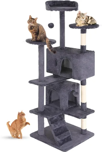 Torre de árbol para gatos de varios niveles: este árbol para gatos ofrece perchas, escaleras y un acogedor condominio para gatos, creando el mejor patio de recreo donde los gatos de todas las edades pueden trepar, rascar, tomar una siesta y explorar libremente. Diseño de muebles para gatos resistente: hecho de materiales de alta calidad, este árbol para gatos ofrece muebles duraderos para gatos y accesorios seguros para gatos, asegurando estabilidad, comodidad y relajación diaria. Postes duraderos para arañar gatos: envueltos en sisal natural, estos postes rascadores fomentan el mantenimiento saludable de las garras y funcionan como rascadores duraderos para gatos de interior mientras protegen los muebles. Cómodas camas y casas para gatos: con camas suaves para gatos y espaciosas casas para gatos de interior, esta torre crea escondites seguros y acogedoras opciones de cama para gatitos para descansar durante el día o la noche. Juguetes interactivos para gatos incluidos: los juguetes integrados para gatos mantienen el tiempo de juego emocionante, mientras que el juguete colgante para gatos promueve el ejercicio, la estimulación mental y proporciona horas de diversión interactiva todos los días.