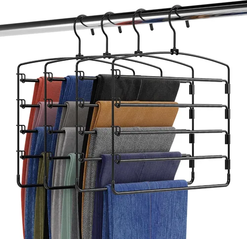 Pregunta sugerida sobre Fontaines - Paquete de 4 perchas de lujo para pantalones de 5 niveles, ultra delgadas y ahorran espacio, gancho giratorio de metal resistente ¿Este producto sí me sirve para lo que necesito?