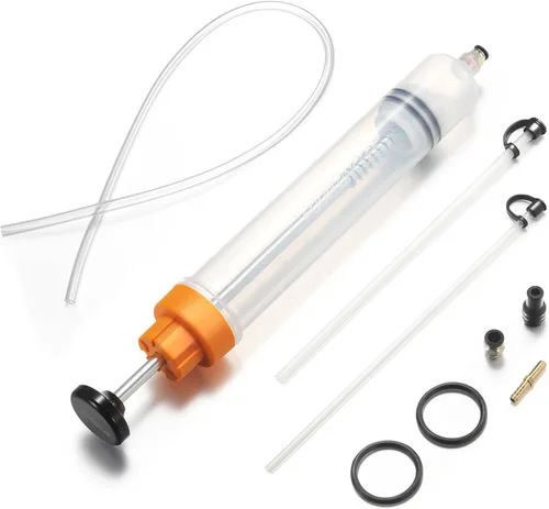 Tubos más largos: La bomba de transferencia de fluido incluye dos mangueras de extensión que se pueden conectar para un alcance de hasta 23" y viene con tapas de tubo que evitan el derrame de líquido. Se incluye una manguera de extensión adicional de 23 pulgadas, que cuando se conecta, es suficiente para alcanzar lugares de difícil acceso SEGURIDAD DE DOBLE SELLO: La bomba extractora de aceite está fabricada con materiales fuertes y duraderos, con un diseño de doble anillo de goma que crea un sello hermético, y un diseño roscado de precisión en el extremo del tubo que evita cualquier fuga CONEXIÓN RÁPIDA: Jeringa de aceite con una hebilla de bloqueo que se puede insertar y desconectar con una ligera presión, conveniente y rápida para extraer el aceite. También viene con una hebilla de repuesto para reemplazar cuando la original se afloja Medición precisa: La capacidad del extractor de bomba de succión de aceite es de 200 cc, monitorea los niveles de fluido con precisión y sabe exactamente cuándo detener el bombeo con la escala marcada (mL y oz.) en el cuerpo transparente de esta bomba extractora de aceite AMPLIA APLICACIÓN: Bomba extractora de aceite adecuada para diversas aplicaciones, incluyendo barcos, equipos agrícolas, cajas de engranajes industriales, motos y vehículos. También ideal para cilindros maestros de freno, carcasas de filtros de aceite, diferenciales y cajas de engranajes
