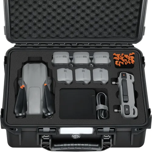 Gran capacidad: el estuche puede acomodar el DJI Air 3 Drone, DJI RC-N2/RC 2, hasta 3 baterías, 1 hub de carga bidireccional y otros accesorios como hélices de repuesto, filtros, correa para el cuello y tren de aterrizaje. Seguro y resistente: hecho de material PP confiable con una carcasa exterior resistente a los impactos que puede soportar 5000 libras. Las tiras de sellado de goma garantizan el nivel de impermeabilidad IP67. Diseño portátil: Pesa 2.2 kg con dimensiones de 13.8 x 11.4 x 4.5 pulgadas. Cuenta con un mango antideslizante para un fácil transporte. Servicio de calidad: viene con una garantía de 12 meses y un servicio al cliente amigable. Sin garantía adicional para el dron DJI Air 3 y sus accesorios. Diseño personalizado: funda rígida YETEETH diseñada específicamente para DJI Air 3 Drone y accesorios.