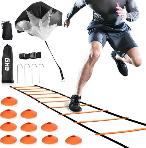 GHB Agility Training Ladder Speed agility ladder 12 Rung 20ft with 6 Cones and Resistance Parachute It has everything you need to put in the work and exercise. Enjoy making up drills by using them, improve your training skills, endurance, speed, agility, etc Premium Training Cones Good for marking out training areas, warm up drills, shuttle and slalom based exercises Speed Agility Ladder The speed agility ladder is good for soccer practice, especially for starters. It is sturdy and worth its weight Resistance Parachute Use it for drills with your team. The parachute will be a really cool for cardio endurance Good Quality & Adjustable The speed agility ladder is of high quality and the space between rungs is adjustable. Ideal Tool for Outdoor & Indoor Sports The speed agility ladder is very helpful for footbald, soccer, basketball drills, hockey, tennis, etc Having Everything You Need It has everything you need to train with and the bag is a extra bonus to carry. 1x speed agility ladder 1x parachute 6 x cones 4 x stakes 1x belt 1 x carrying bag