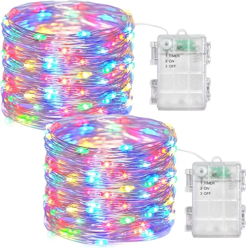 Guirnalda de luces de hadas con temporizador de 33 pies, 2 unidades, 100 luces LED, funciona con pilas, para exteriores, impermeable, para bodas,