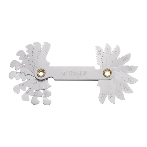Tamaño - Medidor de paso de tornillo métrico de 60° (20 piezas): 0.5 0.6 0.7 0.75 0.8 1.0 1.25 1.5 1.75 2.0 2.5 3.0 3.5 4.0 4.5 5.0 5.5 6.0 6.5 7 .0.000 in Material: acero inoxidable 203 y acabado cromado, combina alta resistencia, buena resistencia, aspecto elegante. No se oxida fácilmente y es de larga duración. Aplicación: mide con precisión las roscas de tornillo internas y externas con cuchillas de rosca de tamaño variado; úsalo para proporcionar el tamaño correcto de la broca, o para ajustar el tamaño para determinar qué broca debe usar. Se utiliza para comprobar el ángulo de la herramienta mientras se cortan roscas en tornos de torneado de metal, mide con precisión las roscas internas y externas con cuchillas de rosca de tamaño variado. Uso: los ángulos de la herramienta de corte de rosca se verifican en las ranuras en V del indicador. Nota: antes de comprar, confirma si el rango de medición del producto es adecuado para el objeto que necesitas medir.