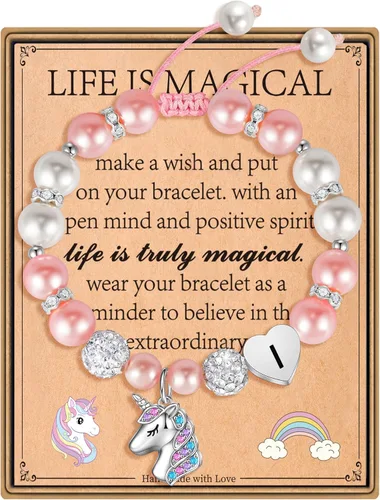 Hidepoo Regalos de unicornios para niñas, perlas rosas y bolas de diamantes de imitación, pulseras de unicornio con inicial de corazón para niñas,