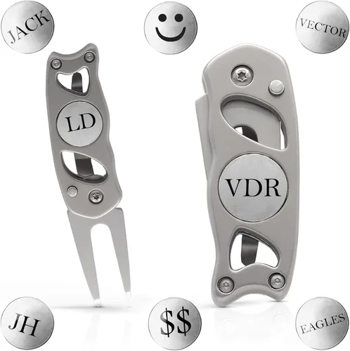 HERRAMIENTA DE DIVOTO DE GOLF: Esta cuchilla de interruptor de acero inoxidable viene con dos marcadores de golf magnéticos extraíbles grabados con láser de níquel plata (uno de repuesto). DIMENSIONES DE LA HERRAMIENTA DE REPARACIÓN: Esta herramienta es de 1 pulgada x 2.75 pulgadas plegada y 4.50 pulgadas abierta. El diámetro de cada marcador de bola es de 0.750 pulgadas. La cuchilla fijadora divot se abre con un dispositivo de botón. MARCADOR DE BOLA PERSONALIZADO: La personalización está grabada con láser permanentemente. El precio incluye personalización. Haga clic en "Personalizar ahora" e ingrese las iniciales, nombre o símbolos que elija. Recomendamos no más de 6 caracteres, pero es tu elección añadir más de 6. Grabado por Indiana Metal Craft en los marcadores de bolas fabricados en Estados Unidos. Se importa la herramienta Divot. FABRICANTE DE CALIDAD: Esta herramienta de reparación tiene un diseño exclusivo con calidad duradera para un uso duradero. En caja individual. Regalo superior: esta herramienta de reparación Switchblade Golf Divot es un accesorio de reliquia de por vida para ser apreciado por generaciones. Gran regalo para cualquier golfista (Navidad, vacaciones, día del padre, etc.)