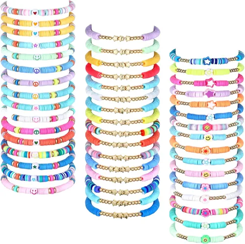 Accesorios preppy: el paquete incluye 48 piezas de pulseras preppy heishi, vienen en 3 estilos, estrella, cara sonriente y signo de paz, 16 piezas para cada estilo, combinadas con cuentas coloridas, hermosas y exquisitas Ajustable y elástico: la circunferencia de esta pulsera de cuentas de arcilla es de aproximadamente 6.27 pulgadas / 15.93 cm, y es elástico, por lo que se ajustará a la mayoría de las personas; Fácil de poner y quitar, no te hará sentir demasiado suelto o demasiado apretado Regalos delicados y dulces: puedes regalar estas pulseras preppy a tu familia o amigos en tu cumpleaños, aniversario y el Día de San Valentín para expresar tu amor por ellos, y estarán felices todo el día Resistente y duradero: el brazalete y2k está hecho principalmente de polímero de arcilla y plástico, es resistente al agua, no se desvanece fácilmente, es suave y ligero; No te hará sentir incómodo incluso si lo llevas durante mucho tiempo Haz tus propias pulseras de estilo: estas pulseras estéticas son ideales para combinar con otras decoraciones, y puedes combinarlas con collares de temática boho (no incluidos) y se pueden apilar con otras pulseras para mostrar tu estilo personal