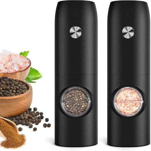 Dispositivo de cocina de carga rápida tipo C: este salero eléctrico y pimentero adopta tecnología avanzada de carga rápida tipo C, carga completa en solo 1 hora. Una carga rápida de 5 minutos es suficiente para las necesidades diarias de condimentos. Es compatible con el uso mientras se carga, por lo que no hay espera durante los momentos de cocción ocupados. Ecológico y eficiente desde el punto de vista energético, ayuda a reducir los residuos al eliminar las baterías desechables. Funcionamiento automático con una sola mano: un elemento esencial para la cocina. No más torsión o esfuerzo manual, simplemente presione un botón para moler especias automáticamente. En comparación con los molinillos tradicionales, es más fácil y preciso. Los compartimentos separados de la batería y las especias evitan el polvo y las fugas, asegurando durabilidad y una vida útil más larga. 5 niveles de grosor ajustables: juego de molinillo de sal y pimienta recargable Ajusta fácilmente la tosquedad con la perilla inferior, gira en sentido horario para moler fino y en sentido antihorario para grueso. Construido con un mango de acero inoxidable 304 duradero, muele especias a la textura perfecta, liberando un aroma fresco y con cuerpo que mejora cada plato. Cámara de especias eléctrica transparente de 2.4 fl oz hecha de material ABS de grado alimenticio, la gran cámara de 2.4 fl oz reduce la necesidad de recargas frecuentes. El cuerpo transparente le permite comprobar el tipo de especia y la cantidad restante de un vistazo. La tapa a prueba de polvo mantiene las especias secas y evita derrames, manteniendo una cocina ordenada. Juego de 2 molinillo de pimienta. El juego de molinillo de sal y pimienta viene en dos colores (blanco y negro) para contener diferentes especias y evitar mezclas. Adecuado para pimienta, sal, romero, comino, hojuelas de chile y mucho más. La luz LED integrada se ilumina automáticamente mientras muele para un condimento preciso cada vez.