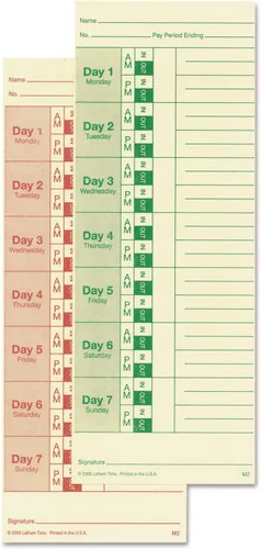Paquete de 100 tarjetas de tiempo semanales; 125 # stock de etiqueta blanca Día 1 - Día 7 (Lunes - Domingo) Cuatro golpes de entrada/salida por día; 2 lados (verde/rojo) Línea de firma del empleado; doble cara Funciona con el modelo Lathem 2121 y todos los relojes de tiempo de impresión lateral estándar