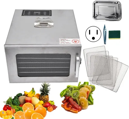 Tipo de artículo: Máquina deshidratadora/secadora de alimentos Usar una secadora ayuda a ahorrar energía en el secado de carne, champiñones, hierbas, frutas o pescado, preservando el sabor y la nutrición. Cuerpo de acero inoxidable, simple y . Material: El anfitrión es acero inoxidable 201, las bandejas son acero inoxidable 304 Color: Plata Potencia nominal: 400 W Tiempo máximo de tiempo: 24 horas Rango ajustable de temperatura de trabajo: 95.0-194.0 °F Número de bandejas: 6 bandejas Tamaño de bandeja: aprox. 10.039 x 7.874 in / 10.04 x 7.87 pulgadas. Tamaño de la máquina anfitrión: aprox. 12.4 x 11.02 x 7.87 pulgadas. Distancia de separación de bandeja: aprox. 1.102 in / 1.10 pulgadas. Peso: aprox. 188.72 onzas. Lista del paquete: 1 máquina deshidratadora de alimentos. 1 cable de alimentación. 1 clip. 1 mango. 1 esponja. 6 bandejas. 1 instrucciones (idioma español no garantizado). Nota: Ten en cuenta que el nuevo tipo y el tipo antiguo de este producto se enviarán al azar, y asegúrate de que no te importará antes de realizar el pedido.