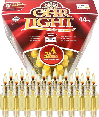 Velas de aceite de oliva precargadas Nuevo producto especial para Menorás de Janucá para Janucá. - Se adapta a menorás de aceite - Aceite de oliva Kosher 100% puro - Tamaño XS - Quema aprox. 45 minutos - Incluye una vela de cera de abejas Shames, tarjeta de folleto con las oraciones de iluminación. - 44 vasos de vidrio, suficientes para todas las noches de Hanukkah - Mechas 100% algodón - Embalado en una caja de cartón exterior para evitar daños y fugas en el envío. Ahora puedes encender la Menorá como lo hicieron nuestros antepasados, con aceite de oliva puro. Estas tazas de aceite precargadas han sido diseñadas específicamente para clientes que utilizan menorás de aceite estándar. Estas tazas de aceite caben en tu Menorah sin complicaciones, sin necesidad de llenado ni preparaciones, simplemente desenrosca la parte superior y enciende las velas. Fácil y limpio. Preparar una menorá con vasos de aceite para encender velas puede ser complicado. Con las velas de aceite de menorá, lo harás de una manera limpia y fácil. Simplemente retira la cubierta y estarás listo para encenderse. Basura cuando termine, no es necesario limpiar el vidrio.