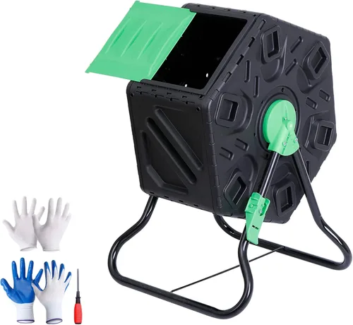 Características: - Cuerpo de plástico PP, buena resistencia a la intemperie y a los químicos, el marco de acero es muy fuerte, tiene una larga vida útil. - El marco de acero sostiene el barril hacia arriba, lo que dificulta que los animales alcancen la basura en el interior. - Permite una rotación de 360 grados para que los desechos en el interior se puedan remover uniformemente, asegurando una descomposición completa. - Ahorro de espacio, ocupa poco espacio, perfecto para pequeños apartamentos y balcones. - Todas las piezas y herramientas están incluidas y se pueden montar en 15-20 minutos. Especificaciones: Color: negro y verde Material: polipropileno y acero Capacidad: 18.5 galones (70 L) Peso del artículo: 11.24lbs Tamaño de la puerta corrediza: 9.5" L * 7.4" W Dimensión total: 23.62"L x 19.29"W x 29.13"H El paquete incluye: 1 x Tambor de Compostaje 1 instrucciones (idioma español no garantizado) 1 par de guantes