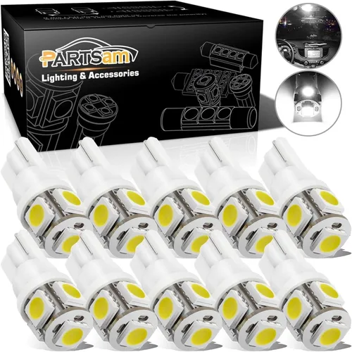 Bombilla LED T10 Blanca: Modelo de Reemplazo como T10, 168, 194, 2825, W5W, 147, 152, 158, 159, 161, 175, 184, 192, 193. Tamaño base estándar T10 - cuña de 10 mm y longitud de 26 mm, estas bombillas LED para interior de coche T10 son casi del mismo tamaño que las bombillas halógenas. Bombillas LED Superbrillantes 194 6000K: Diseñadas con 5 piezas de chipsets SMD 5050, la bombilla de luz xenón blanca 168 proporcionará una iluminación libre de errores Canbus de 360 grados y efectos de iluminación superbrillantes de 6000K. Amplia aplicación: la bombilla LED 194 168 para luz interior del coche es ideal para la luz de mapa interior, luz de cúpula, luz de matrícula, luces de lectura, luz de cortesía, luces de guantera y luz de maletero de tu coche. Fácil de instalar: la bombilla LED T10 2825 W5W es Plug and Play. Todo lo que necesita hacer es quitar las cubiertas de la lámpara y reemplazarlas directamente. AVISO: Si el LED no se enciende, simplemente gíralo 180 grados (invierte la polaridad). No proporcionamos enchufes T10. Lo que obtendrás: 10 bombillas LED blancas 194 168 T10.
