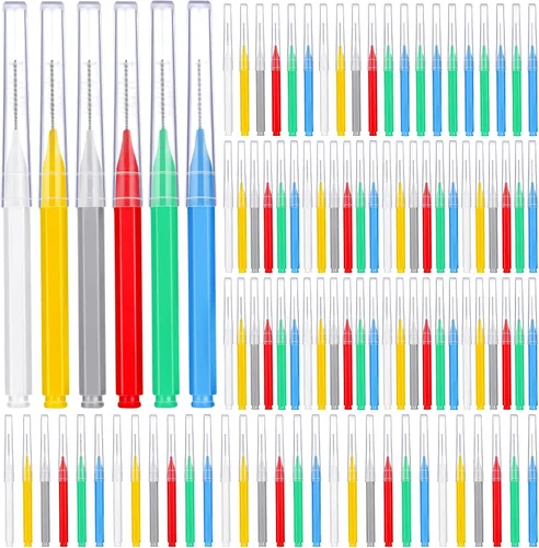 El paquete incluye: recibirás 100 piezas de cepillos interdentales tipo palillo en diferentes colores, cantidad suficiente puede satisfacer tus necesidades de uso diario y reemplazo, y también puedes compartir con tu familia y amigos, apto para uso familiar Diseño cuidadoso: el cepillo de tirantes solo elimina los residuos, limpia el espacio entre los dientes, pero también evita el mal aliento y el patrón de dientes, que es un práctico producto de cuidado bucal; está diseñado con alambre recubierto de nailon para mantener tus encías seguras y hacer que tus dientes estén saludables Cómodo de llevar: los limpiadores de brackets son ligeros y portátiles, cómodos de almacenar y transportar, seguros de usar, aportan más comodidad a tu vida, se pueden usar para el hogar, oficina, viajes y otras ocasiones Amplios usos: los cepillos de hilo dental son prácticos para eliminar manchas de té, café, residuos de alimentos o suciedad cómodamente, haciendo que tus dientes estén más limpios y hermosos, adecuados para el hogar, viajes y trabajo, lo que te brinda una manera más fácil de limpiar tus dientes de manera efectiva y te da una mejor experiencia de uso Varios tamaños: la dimensión de los cepillos de palillos de dientes es diferente, que están disponibles para tus diferentes opciones, lo que te ofrece un montón de opciones