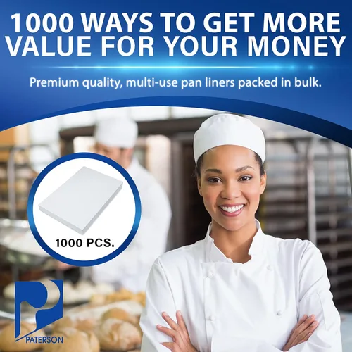 Revestimientos para hornear: revestimientos de sartén recubiertos de quilon para hornear comercial. Ideal para panaderías, cafeterías y restaurantes. Los revestimientos para sartenes Paterson cuentan con una superficie dura y sin agujeros. Perfecto para temperaturas de hasta 425 grados Fahrenheit. Maneja 1-2 ciclos de horneado por hoja. Cantidad comercial: reabastece tus suministros con nuestro paquete rentable de 1000 forros para sartenes. Calidad estándar de la industria y entrega a granel conveniente a un precio asequible. Sartenes de tamaño medio: cada forro comercial precortado mide 12 x 16 pulgadas para mayor comodidad. Hecho para cubrir una sartén de 1/2 tamaño. Utiliza nuestros revestimientos para hornear de superficie resistentes a los palos para conservar bandejas y panecillos. Ideal para hornear galletas, pasteles, postres, entrantes, aperitivos y mucho más. Duradero y eficiente: papel a prueba de grasa tratado con revestimiento antiadherente Quilon para evitar que se dore. Nuestros revestimientos para sartenes hacen que los alimentos sean más seguros y mejoran el sabor a través de una mayor retención de humedad. Evite la acumulación de manchas y alimentos en sartenes, sábanas y bandejas. Eliminación rápida y fácil. La grasa entra en la basura, no por el desagüe. DESDE 1923 - Paterson Paper se especializa en la impresión y conversión de productos de papel. Proporcionamos productos a las industrias de restaurantes, hostelería y panadería. Nuestros productos incluyen servilletas impresas y lisas, manteles individuales, posavasos, rollo de papel, tazas para hornear y bandejas para hornear. Fabricado siempre en los Estados Unidos.