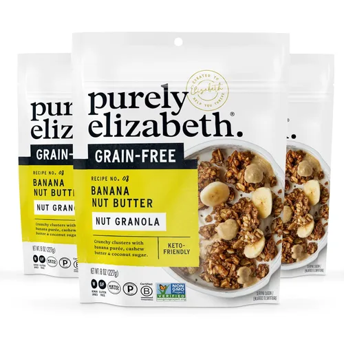 INCLUYE: 3 Bolsas de Granola Sin Granos con Mantequilla de Nuez y Plátano (8 onzas). CERTIFICADO PALEO Y KETO: ¡Seguir una dieta paleo o keto se ha vuelto más fácil! Fabricado con semillas de chía, semillas de calabaza, cero azúcares falsos y lleno de racimos crujientes para una solución paleo y ceto natural y satisfactoria. Certificado libre de gluten, vegano y sin OMG: fabricado con ingredientes limpios y simples que están libres de aditivos y organismos modificados genéticamente. Endulzada con azúcar de coco: La granola sin granos se prepara con azúcar de coco sin refinar, un edulcorante de bajo índice glucémico que no te hará perezoso a medida que avanza el día. Rápido y saludable: cuando comes mejor, te sientes mejor. Es así de simple. Es por eso que Purely Elizabeth utiliza superalimentos con sabores vibrantes para crear deliciosos alimentos que te ayudarán a prosperar en tu viaje de bienestar. Combínalo con leche, espolvorea sobre un licuado de frutas, encima de tu yogur, o disfruta de nuestra granola sin granos directamente de la bolsa.