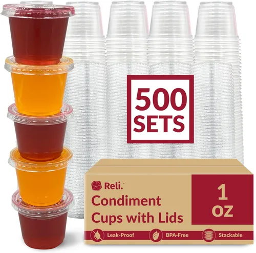 • Aderezo para ensaladas, salsa para sumergir Sin derrames: nuestras tapas sellan herméticamente con un clic audible, manteniendo el contenido seguro, seguro y fresco Construido fuerte: Las copas resistentes a las grietas sin BPA no se rompen ni gotean durante el transporte o mientras están en uso. Fácil almacenamiento: cada taza y tapa de 1 oz es desechable y apilable para un almacenamiento y acceso convenientes. Multiusos: perfecto para aperitivos, control de porciones, porciones de medicamentos, salsa y salsa Valor a granel: Mantenga sus porciones individuales frescas por más tiempo, ¡perfecto para restaurantes o fiestas familiares! Sigue desplazándote por todos los tamaños de tazas de porciones, además de más artículos esenciales de servicio de alimentos y cocina de Reli.