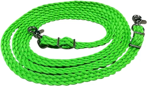 Este es un par de riendas de lima neón trenzadas a mano hechas del mejor paracord comercial de nailon 550. Son de 5/8 pulgadas de ancho y eliges la longitud. Se pueden ajustar muy fácilmente a una longitud más corta con la hebilla Conway adjunta. Se fijan a la broca con un broche de gatillo niquelado. Estas riendas están muy bien hechas con los extremos trenzados en la trenza para un acabado muy suave.