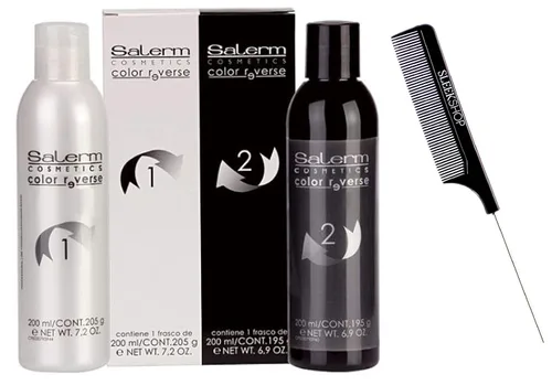 Salerm Cosmetics Color Reverse, Removedor de Color de Cabello (con Peine de Cola de Rata de Acero Sleekshop Stinaface) Elimina el Tinte de Color de Cabello (Paso 1 + Paso 2 (botellas de 7 onzas)) Salerm Color Reverse elimina solo los pigmentos artificiales depositados dentro del cabello, respetando la estructura del cabello, así como su color natural. Es el tratamiento más seguro y delicado disponible para eliminar el color de oxidación del cabello. Un polímero crea un gel estable que permite a los componentes eliminar los pigmentos artificiales del cabello con mayor facilidad y sin dañar la estructura del cabello. Elimina los pigmentos de color artificiales del cabello, sin alterar el pigmento natural