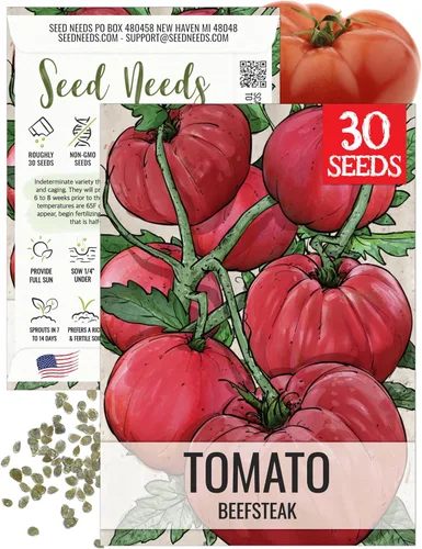 Los tomates pertenecen a la especie Lycopersicon esculentum (comúnmente conocida como Solanum lycopersicum en la taxonomía moderna), un miembro de la familia de las solanáceas, conocida por producir algunas de las variedades de tomate más grandes y jugosas. Características: Estos tomates son famosos por su tamaño masivo, a menudo pesan 1-2 libras o más por fruta, con una carne carnosa y densa y menos semillas en comparación con otros tipos, lo que los hace ideales para rebanar y sándwiches. Apodos: Frecuentemente llamados "Tomates de Carne" o "Big Reds" (dependiendo del cultivar), son famosos por su sabor robusto, que equilibra la dulzura y la acidez. Cultivo a partir de semillas: Comience las semillas en el interior 6-8 semanas antes de la última helada, sembrándolas ¼ de pulgada de profundidad en una mezcla para macetas cálida (70-80 ° F o 69.8-80.6 °F) y bien drenada; trasplante las plántulas en un suelo rico y bien modificado a pleno sol después de endurecerse, espaciando las plantas de 2 a 3 pies de distancia para acomodar sus enredaderas en expansión. Calidad: todas las semillas de tomate envasadas por Seed Needs están destinadas a las temporadas de cultivo actuales y siguientes. Todas las semillas se almacenan en una instalación de temperatura controlada que está libre de cantidades significativas de humedad. Cantidad: Seed Needs ofrece cantidades generosas. Puede compartir con amigos y familiares, o puede guardar las semillas adicionales hasta la siguiente temporada, si se almacena correctamente. Paquetes: Cada paquete de semillas muestra una ilustración ingeniosa de la variedad que se va a cultivar, así como información detallada de siembra de semillas en el reverso. Miden 3.5 pulgadas de ancho por 5 pulgadas de alto. Promesa: Seed Needs nunca suministrará a sabiendas productos de semillas a base de OGM. La gran mayoría de nuestras semillas son de polinización abierta y reliquia, con la excepción de algunos híbridos. Germinación: los paquetes Seed Needs contienen algunas de las semillas más frescas disponibles. Directo de los productores. Si se siembra correctamente, comenzará a ver resultados en solo cuestión de días. Frescura: Todas las semillas se envasan en envases resistentes al desgarro y a la humedad. ¡Esto mantiene las semillas mucho más frescas que la selección de competiciones!