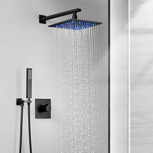 ➤ Cabezal de ducha y cabezal de ducha de mano: cabezal de ducha de lluvia de 10 pulgadas y cabezal de ducha de mano con tecnología de sobrecarga, proporciona sin esfuerzo una presión de agua superior. Ducha consistentemente potente incluso bajo baja presión de agua. El cabezal de ducha grande puede cubrir todo el cuerpo debajo de la ducha y simplemente enjuagar la espuma del cuerpo ➤ Sensor de temperatura de 3 colores: ① Luz roja de 40 °F. 3 opciones de color cambian automáticamente de acuerdo a la temperatura del agua, seguro y cómodo. La ducha LED de techo se ilumina con flujo de agua, no necesita batería. Ahorro de energía y protección del medio ambiente ➤ Grifo de ducha negro clásico: el elegante sistema de ducha en acabado negro mate y aspecto elegante complementa cualquier decoración. Además, nuestros productos están hechos de materiales de acero inoxidable de alta calidad, antioxidantes y de larga duración. Te permiten disfrutar de una ducha de lluvia de lujo ➤ Incluye: este juego de ducha incluye cabezal de ducha cuadrado fijo de 10 pulgadas, cabezal de ducha de mano, barra de brazo de ducha, manguera de ducha de 59 pulgadas, soporte de ducha y cuerpo de válvula áspero, todo lo que necesitas para obtener la mejor experiencia de ducha| ➤ Servicio al cliente amigable y profesional: si tienes alguna pregunta sobre nuestro producto, no dudes en enviarnos un mensaje. Siempre estamos aquí para ayudarle. nuestro producto, ➤ Servicio al cliente amigable y profesional: si tienes alguna pregunta sobre nuestro producto, no dudes en enviarnos un mensaje. Siempre estamos aquí para ayudarlo