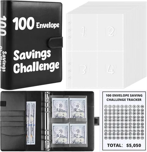 Lo que obtienes: 1 pieza de carpeta de polipiel A5, 25 sobres de efectivo de 6 agujeros preimpresos con números del 1 al 100, 1 hoja de seguimiento de $1 a $100. Utiliza nuestra carpeta de ahorro de dinero para administrar tus finanzas de manera efectiva. Material premium: 100 ranuras para sobres de efectivo fabricadas con material superior. Es resistente a desgarros e impermeable, lo que puede proteger tus artículos del agua y el polvo, asegurando que duren durante todo tu desafío de ahorro. Fácil de usar: ¡Cada vez que ahorres una cierta cantidad, marca el icono del sobre correspondiente! ¡Cuando marcas todos los íconos, has completado el desafío de ahorro! De esta manera, puede rastrear fácilmente su progreso de ahorro Cuaderno de Anillas para el Desafío de los Sobres: Ya sea que estés ahorrando para el pago inicial de una casa, unas vacaciones o un fondo para días lluviosos, nuestro Desafío de Ahorro con 100 Sobres es tu compañero confiable en tu viaje financiero. Oferta práctica: el libro de ahorros de SKYDUE es una oferta reflexiva y práctica para amigos y familiares, ayudándoles a iniciar sus objetivos de ahorro con estilo y comodidad.