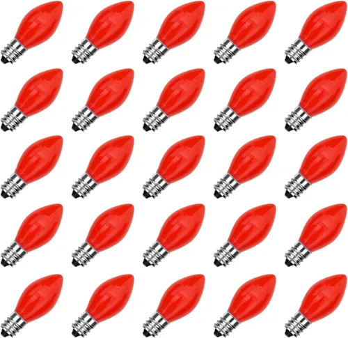 Bombillas rojas de cerámica C7: 25 bombillas C7 E12, cada bombilla incandescente de 120 V y 5 vatios se adapta a enchufes de base de candelabro E12. Las bombillas de repuesto de luces de Navidad C7 miden 1.0 pulgadas de ancho por 2.25 pulgadas de alto (incluyendo la base) Luces de Navidad antiguas: las luces de Navidad vintage impermeables están hechas de material de vidrio cerámico único, las bombillas de cerámica C7 son más fáciles de limpiar y no se desvanecen y se ven muy elegantes y generosas. Las bombillas de repuesto C7 para árbol de Navidad tienen una vida útil de 2,000 horas Luces decorativas de Navidad: estas bombillas E12 Edison son perfectas para varios espacios y eventos como bodas, Navidad, Halloween, día de San Valentín, carnavales, fiestas de cumpleaños y decoración del hogar. La luz nocturna roja puede crear un ambiente colorido y divertido para tu evento o fiesta Bombilla con certificación UL: las luces de Navidad incandescentes C7 para exteriores están listadas por UL para uso en interiores y exteriores. Bombilla E12 para bombillas de lámpara de sal, bombillas de araña, bombillas calentadoras de cera, lámparas de velas, luces de pared, luces nocturnas, cuerdas de luz de patio al aire libre, luces de jardín, luces de cadena de Navidad, luces de vela de ventana, luces de árbol de Navidad Fácil de instalar: la bombilla roja tiene una base de níquel que protege contra los elementos si eliges usar tus bombillas al aire libre. Instala las bombillas en cadenas de luces de Navidad, lámparas de sal, luces de clip y otras decoraciones. Después de apretar la bombilla, enciende el interruptor y la luz se encenderá inmediatamente. Estas bombillas de 5 vatios y 120 V son fáciles de instalar en las luces de cadena de Navidad