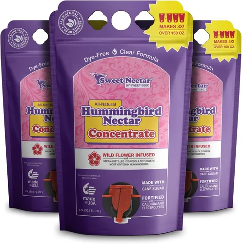 Se mantiene fresco por más tiempo: el néctar concentrado de colibrí Sweet Seed de 1.5 L está hecho con azúcar de caña pura y fortificado con calcio y electrolitos para garantizar un crecimiento saludable de la cáscara de huevo y prevenir la deshidratación, proporcionando a los colibríes los nutrientes esenciales que necesitan para sobrevivir y prosperar. Lleva colibríes a tu patio trasero con el mejor néctar de colibrí disponible. ¡3 veces el volumen que está listo para usar! Todo lo que sus colibríes necesitan: nuestro néctar de colibrí está impregnado con aguas de flores silvestres claras y destiladas al vapor sin químicos, lo que lo convierte en la fuente de alimento preferida para los colibríes en la naturaleza. Nuestro néctar contiene todo lo que los colibríes necesitan y nada que no, proporcionando un ambiente más seguro y saludable para ellos Simplemente vierte, mezcla y sirve: conveniente y fácil de usar, nuestro néctar de colibrí es extra concentrado, eliminando las conjeturas al alimentar a tus colibríes. Simplemente vierte, mezcle y sirva, y disfrute de la belleza de estas increíbles aves en su propio patio trasero. Nuestro néctar hace que sea fácil proporcionar lo mejor para tus colibríes Fabricado en los Estados Unidos: nuestro néctar de colibrí está empaquetado de una manera respetuosa con el medio ambiente. Nuestra exclusiva bolsa patentada es libre de BPA, cumple con la FDA, totalmente reciclable y reduce la huella de carbono hasta en un 85%. Este embalaje también mantiene tu néctar fresco, asegurando que dure mucho después de abrirlo Infundido con calcio y electrolitos: Invierta en lo mejor para sus colibríes y compre nuestro néctar de colibrí de alta calidad. Nuestro néctar es puro, natural y atraerá colibríes a tu patio trasero y los mantendrá regresando por más. ¡No esperes, compra tu néctar de colibrí hoy y disfruta de la belleza de los colibríes en tu propio patio trasero!