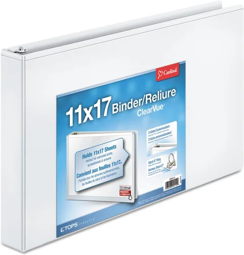 Almacena documentos de 17 pulgadas de ancho x 11 pulgadas de alto, ideal para hojas de cálculo. La superposición transparente en la parte delantera, trasera y lomo te permite personalizar la cubierta. Los anillos inclinados en forma de D sostienen un 25% más de material que los anillos redondos estándar. Tablero de cubierta hecho de fibra 100% reciclada con al menos 98% de fibra post-consumo. Blanco, 1-1/2 pulgadas.