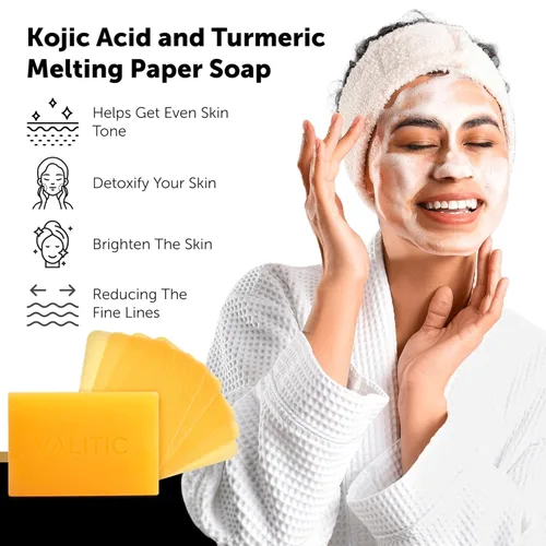 Potente corrección de manchas oscuras: los jabones originales de dúo Valitic combinan ácido kójico y cúrcuma para ayudar a combatir las manchas oscuras, el tono desigual de la piel y la hiperpigmentación para una tez radiante Infundido con ingredientes que aman la piel: el jabón de ácido kójico y cúrcuma está lleno de vitamina C, retinol, colágeno y ácido hialurónico para apoyar el antienvejecimiento, mejorar la elasticidad y promover una apariencia más suave y brillante Frescura para llevar: el juego incluye 2 jabones en barra de ácido kójico y 2 paquetes de 100 hojas de jabón de papel kójico fundido. Mantén tu rutina de cuidado de la piel en casa, mientras viajas, en el trabajo o al aire libre con un lavado facial conveniente e higiénico en cualquier momento y en cualquier lugar Cuidado eficaz para todo tipo de piel: este dúo de limpieza de jabón de ácido kójico ofrece una exfoliación e hidratación suaves, dejando la piel fresca, suave y nutrida sin irritación. Ideal para uso facial o corporal: manos, cuello, zona del bikini, muslos internos y axilas Libre de SLS y parabenos: las fórmulas veganas y libres de crueldad son suaves pero efectivas, lo que las hace ideales para el uso diario en cualquier tipo de piel