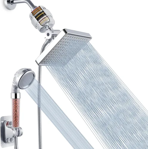 SPA EN CASA - El nuevo cabezal de ducha filtrado de Voolan contiene una versión mejorada de carbón activado de alta calidad, vitamina C y bolas minerales/cerámicas, que filtra dos veces más de suavizante de agua, elimina el cloro, metales pesados y olores, permitiéndote a ti y a tu familia ducharte con agua limpia. Cabezal de ducha de lluvia - Tiene un aspecto lujoso hecho de plástico ABS inoxidable con chapado en cromo. Puede expulsar la lluvia de alta presión de agua caliente que permite que todo tu cuerpo pueda sentir el aguacate. Su conector de bola giratoria se puede ajustar a cualquier ángulo que desee, dándote una experiencia de ducha en cascada de hotel. Ducha de mano de alta presión: el agua de doble filtrado reduce eficazmente las impurezas residuales en el agua para una piel más suave y saludable, ajuste de ducha de 3 rociadores y una manguera de ducha de 59 pulgadas de largo, también es ideal para bañar niños, lavar mascotas y aplicaciones de limpieza. SISTEMA DE DUCHA PARA EL CUIDADO DE LA SALUD - Nuestro cabezal de ducha de alto flujo está hecho de material ABS de grado alimentario, puede filtrar agua blanda, el juego de ducha incluye: cabezal de ducha cuadrado de 6", ducha de mano de 3 rociadores, filtro de 23 capas con cartucho, manguera de 59", desviador de 3 vías, soporte autoadhesivo, restrictor de flujo, cinta de teflón. Fácil de instalar: no requiere herramientas. Simplemente atornilla a mano. Después de la instalación, enjuaga durante 10 minutos para eliminar cualquier acumulación de carbono en el nuevo filtro. (El agua negra sale durante el primer enjuague) Si tienes algún problema o pregunta, ponte en contacto con nosotros a través de Amazon. Nos pondremos en contacto con usted en 24 horas.